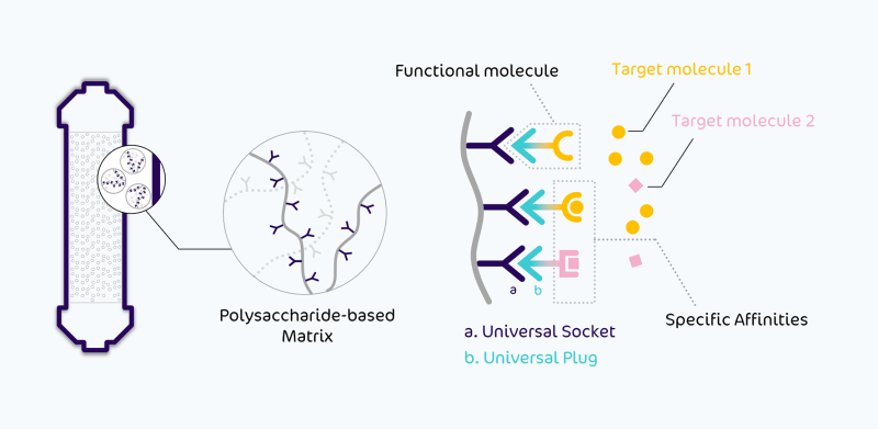 The matrix has a polysaccharide backbone that can be easily cross-linked. We create active cross-linking sites (ACLS), which we refer to as 'universal plugs and sockets', on the polysaccharide backbone through unique chemical modifications. These sites enable desired functional groups/molecules to bond quickly and easily onto the backbone, creating enzyme catalytic or affinity activity. This enables multiple enzymatic catalysis and combined affinities to achieve desired complex functions.